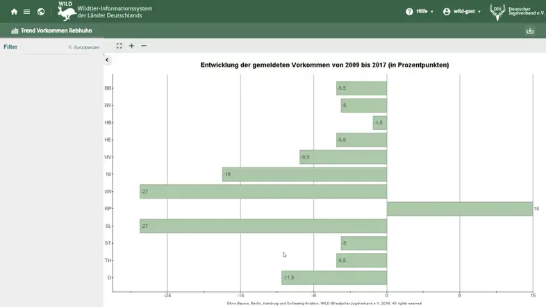Durch neue Darstellungsform können sich Jägerinnen und Jäger, Wissenschaftlerinnen und Wissenschaftler sowie Naturschützerinnen und Naturschützer nun einen schnellen Überblick über die Entwicklung der Populationen von 17 verschiedenen Wildtierarten in den einzelnen Regionen verschaffen. Für die Auswertung der Daten stehen mehrere Aufbereitungsformen zur Auswahl. Die Ergebnisse können sowohl als Diagramm, Tabelle oder als Karte angezeigt und gespeichert werden. Größter Vorteil des neuen Portals ist nach Kazakos’ Einschätzung die übersichtliche Darstellung der mehrjährigen Entwicklung.